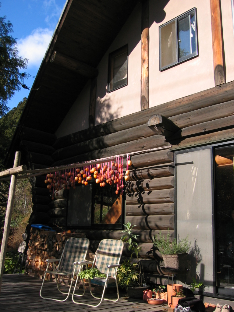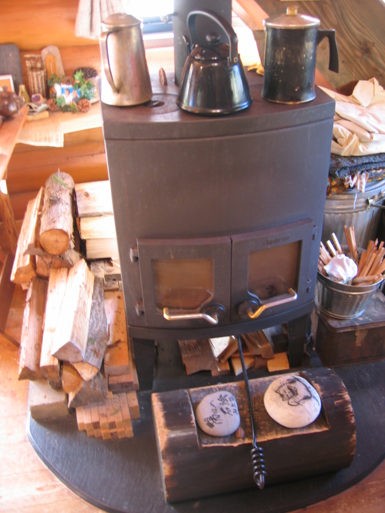 軒先に柿が干してある小さなログハウスのお店に入ると、そこには薪ストーブに火がつけられていて、外とは違う暖かい空気に包まれました。
