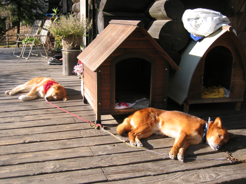 食後の運動も済み、15時のおやつも済んだので、寒くなる前に家に着けるよう早めにお店を出ることにしました。テラスではお店のオーナーの家族でもあるワンコが、気持ち良さそうに仲良く昼寝をしていました。